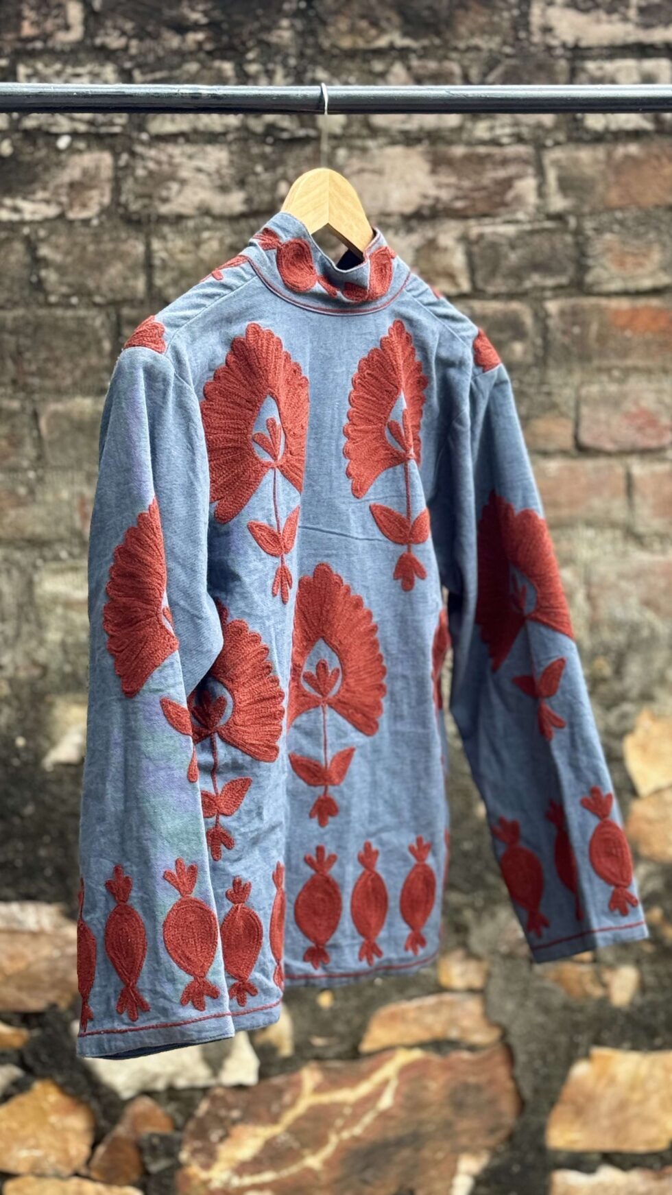Elevate your festive and ethnic look with this stunning Suzani Embroidered Velvet Jacket. Crafted from premium-quality soft velvet fabric, this jacket offers a luxurious feel and rich texture that enhances every outfit. The intricate Suzani embroidery adds a royal charm and artistic appeal, making it a perfect fusion of traditional craftsmanship and modern style.