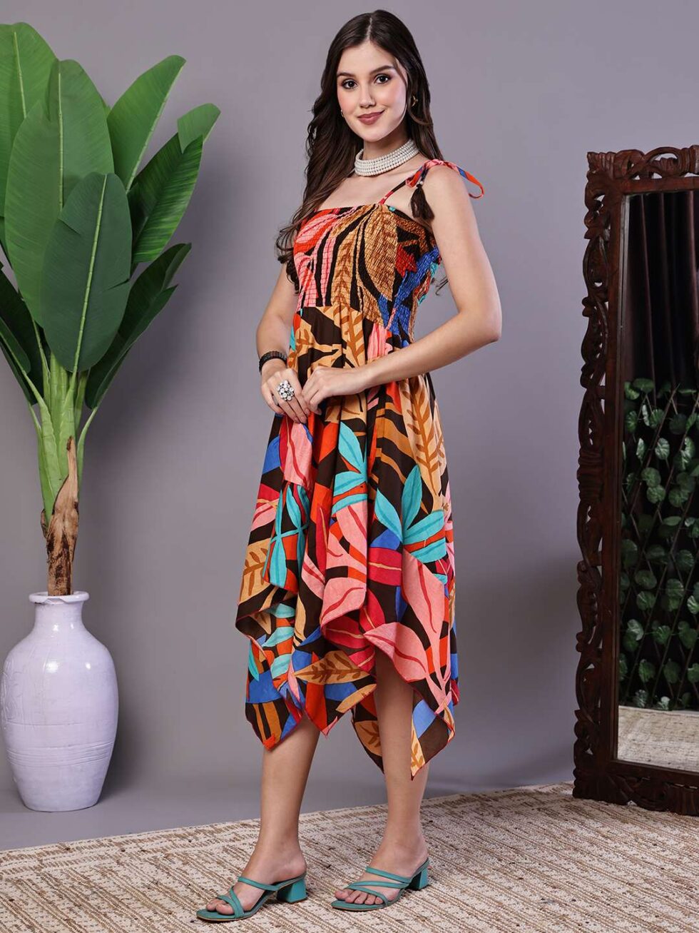 Effortlessly stylish dress with a vibrant abstract print, tie-up shoulder straps, and a chic high-low handkerchief hemline ? perfect for casual days or evening gatherings.